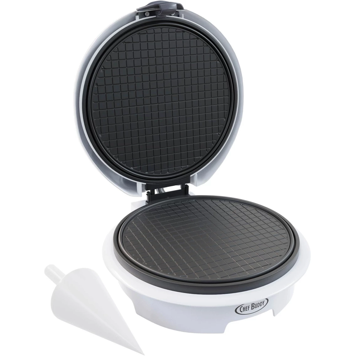 Ice cream without the waffle cone is like peanut butter without jelly. Enjoy delicious ice cream treats wrapped in crispy, crunchy, golden-brown waffle cone goodness straight from the kitchen with the Chef Buddy Waffle Cone Maker. Produce waffle cones and other delectable desserts like lace cookies in just minutes right on the counter. The non-stick cooking surface makes clean-up a snap so there’s more time spent enjoying dessert and less time scrubbing. Model: M031800. .