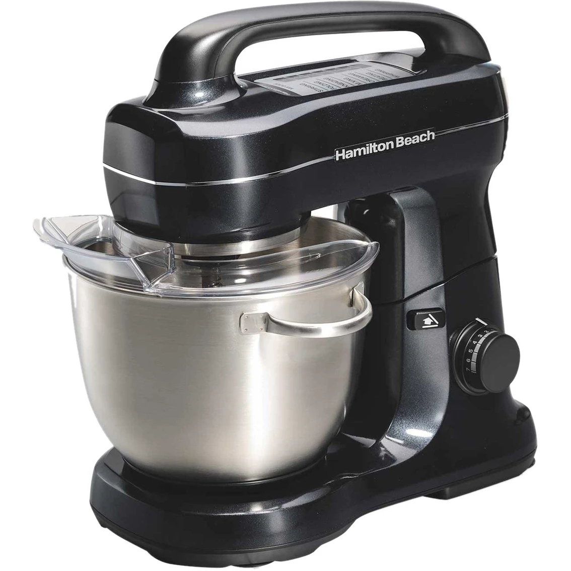 Built for a variety of batters and mixes, this Hamilton Beach Stand Mixer can do everything from whip delicate meringues to mix sticky bread dough. The powerful 300 watt motor can handle the thickest of ingredients, including those peanut butter chocolate chip cookies your family devours. And the best part is, you never have to scrape the bowl or hand-mix at the end β the planetary mixing action rotates the beaters around the entire bowl, for even and complete mixing. Seven speeds lets you go from a slow stir to a fast mix, with exact control at each one. Plus, a helpful guide at the mixerβs top lets you know which speed to use for various mixing methods. Nonslip feet keep the mixer still while in use and the splatter shield guards against messy drips, drops and spills. Attachments include a flat beater, dough hook and whisk. All attachments, as well as the stainless steel 4 qt. mixing bowl, are dishwasher-safe for fast cleanup. Planetary mixing action rotates the beaters around the 4 qt., stainless steel bowl, for even and complete mixing. No scraping necessary. This stand mixer has the same mixing action as KitchenAid stand mixers. Tilt-up head for adding ingredients and changing attachments quickly. Mix thick batters and doughs like breads, cookies and more with ease. For more mixing versatility. Flat beater and dough hook are nonstick and all three attachments are dishwasher-safe. A splatter shield guards against messy drips, drops and spills. Seven speeds lets you go from a slow stir to a fast mix, a helpful guide at the mixerβs top lets you know which speed to use for various mixing methods.