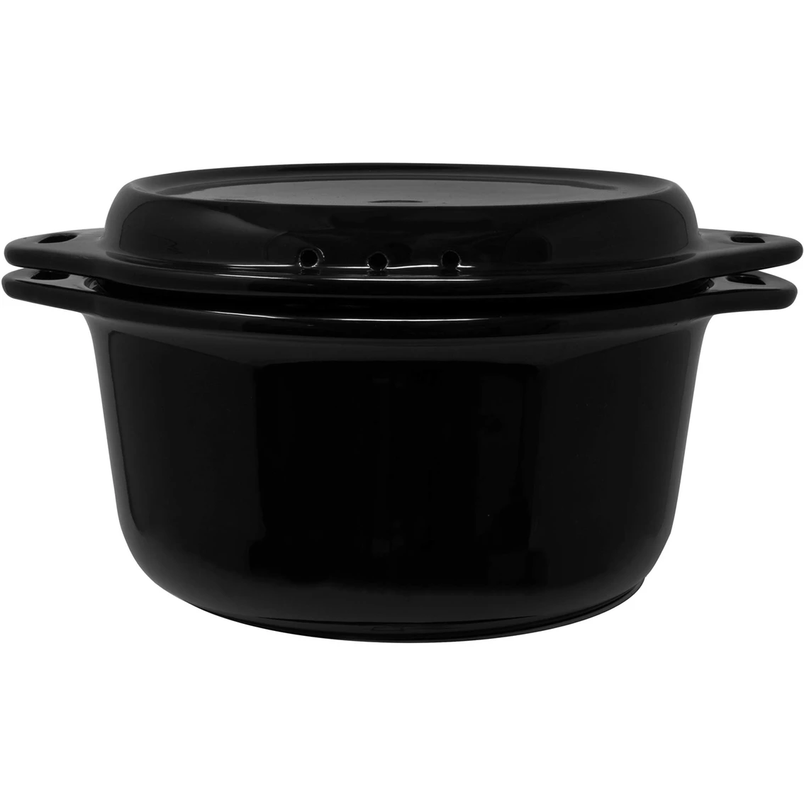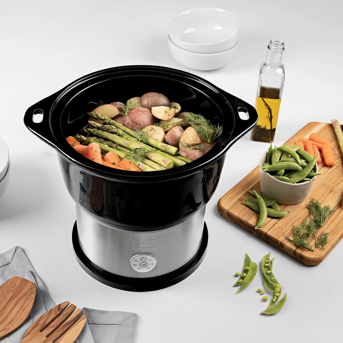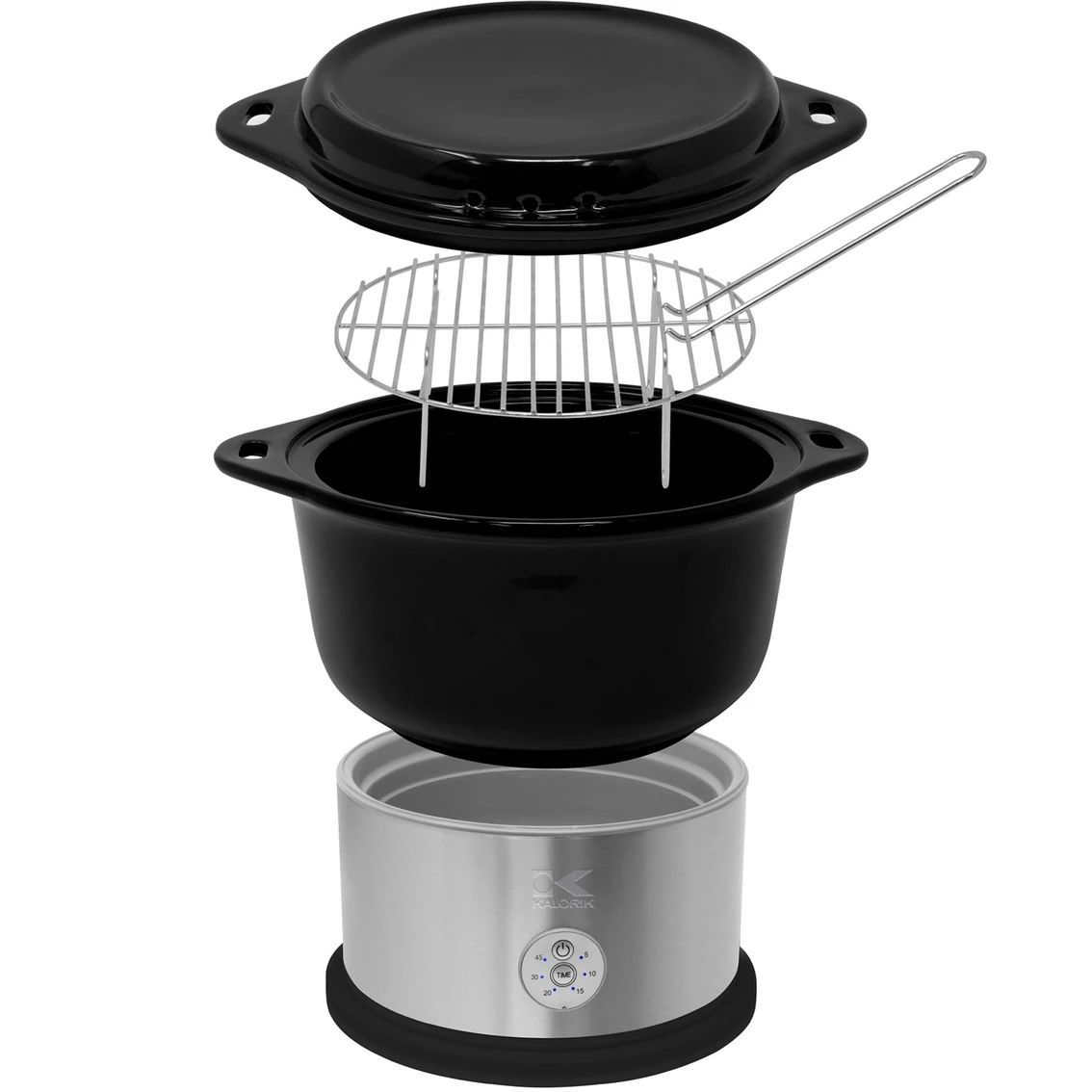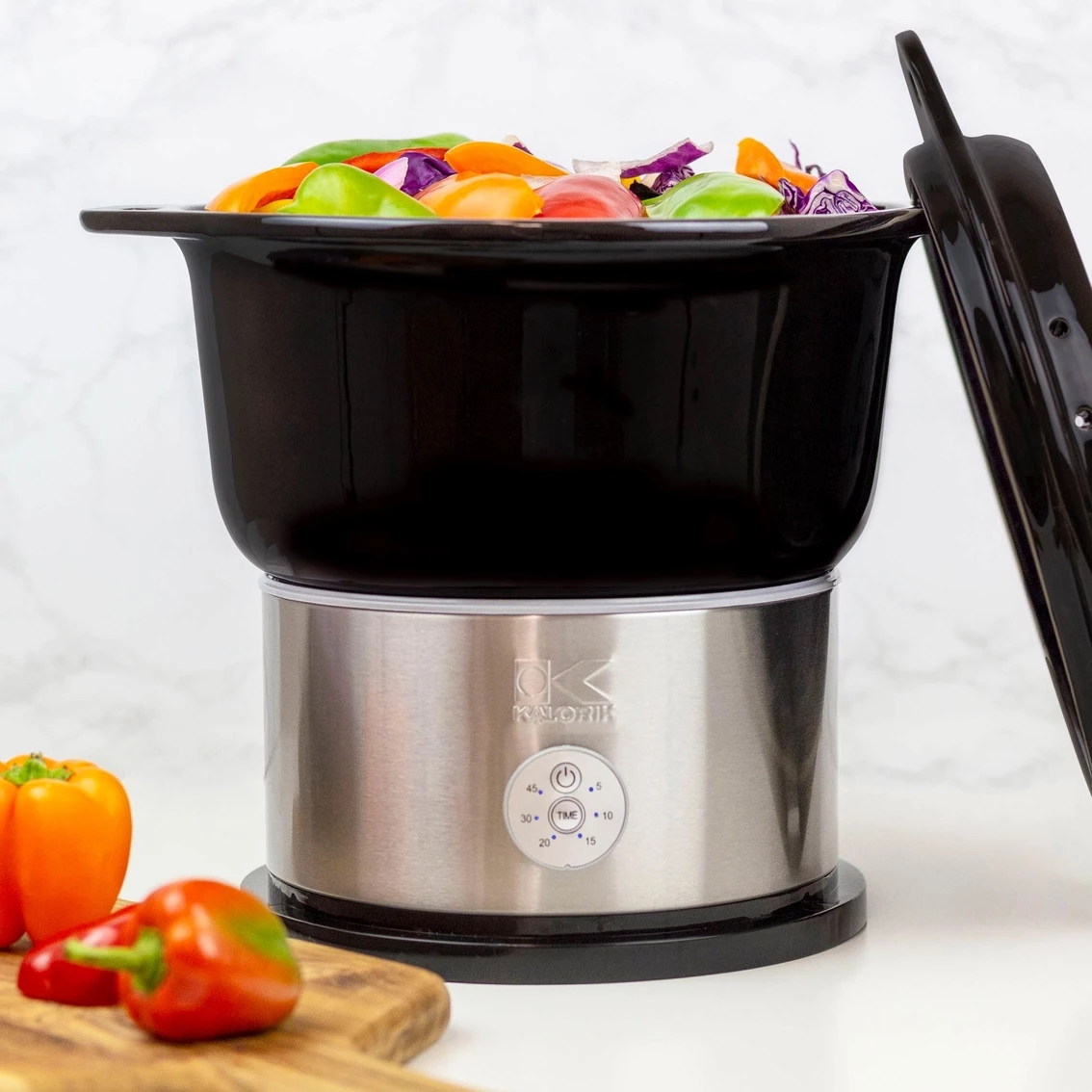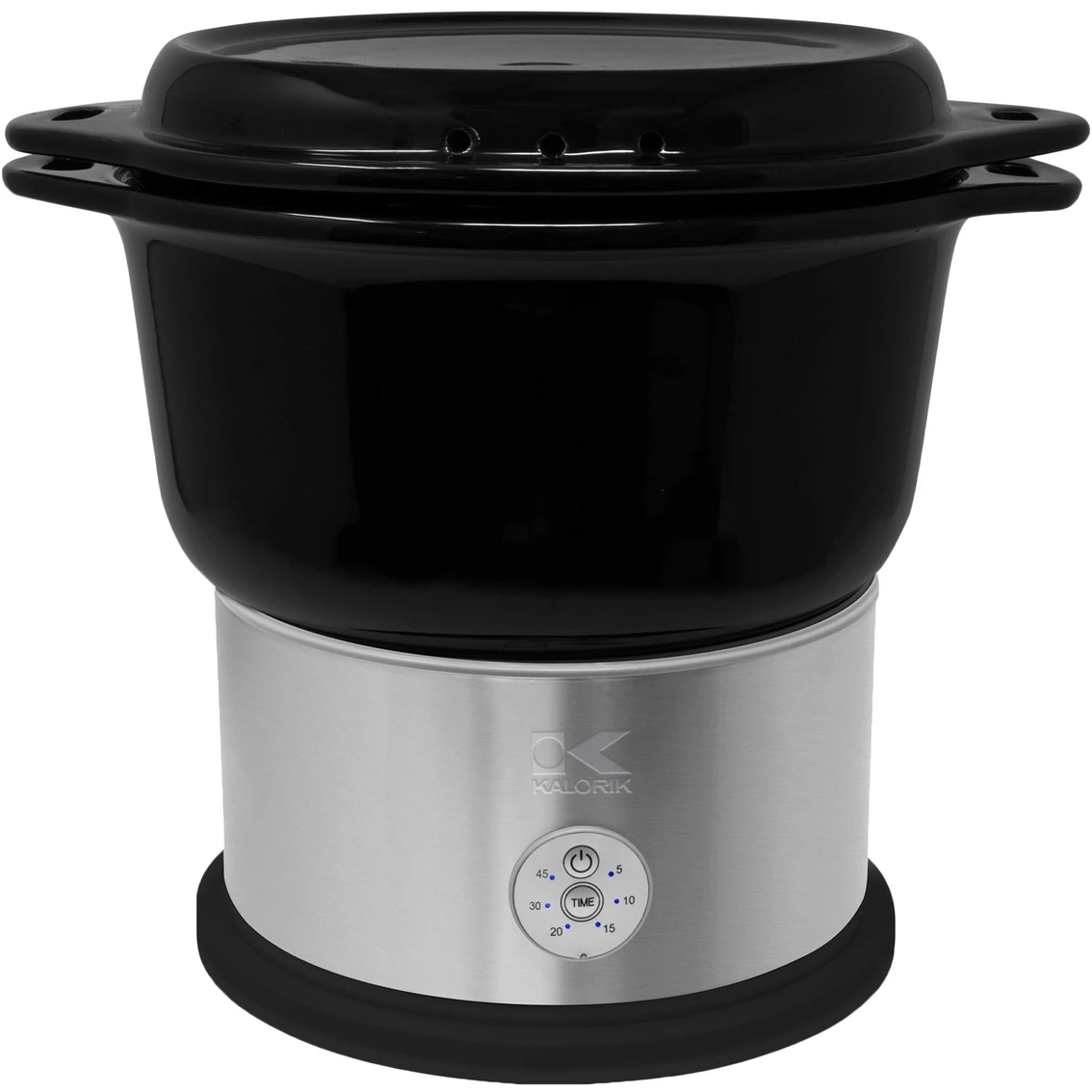 Enjoy healthy, perfectly steamed meals, quickly and easily, with the Kalorik 4.8 Quart Ceramic Steamer with Steaming Rack. The BPA-free and lead-free ceramic pot includes a stainless steel steaming rack with a removable handle, allowing you to steam two layers of food simultaneously. The steamer features easy digital controls and an adjustable 45-minute timer. Heat resistant potholders ensure safe handling. The set also comes with a lid, serving platter and drip-tray in one. The base and rack fit neatly inside the pot, for easy, compact storage. Model: DG 44815 BK.