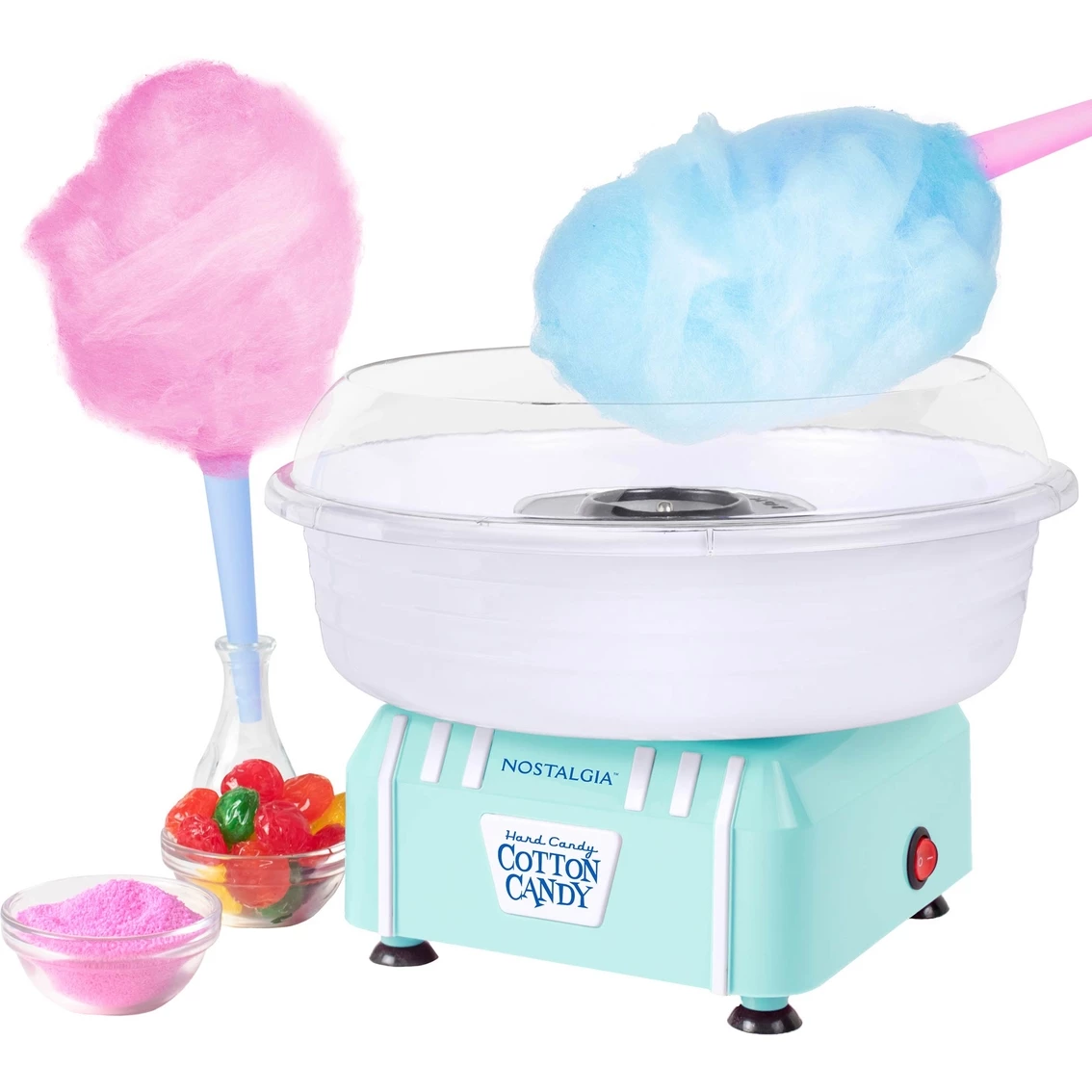 Bring the fun of fluffy, melt-in-your-mouth cotton candy right into your kitchen with the Nostalgia Electrics Hard & Sugar-Free Candy Cotton Candy Maker. This unit allows you to use your favorite hard candies or flossing sugar to create a cotton candy cones the whole family will love. A clear rim acts as a protective guard and allows for easy viewing of the cotton candy being made. Included are two reusable cones, a sugar scoop and extractor head. Unique extractor head allows you to use traditional flossing sugar or your favorite hard candies to make delicious cotton candy. Simple operation — warm up the unit, add your flossing sugar, and enjoy your cotton candy in just a few short minutes. Retro design. Unit disassembles for easy cleaning. Model: PCM205PK.