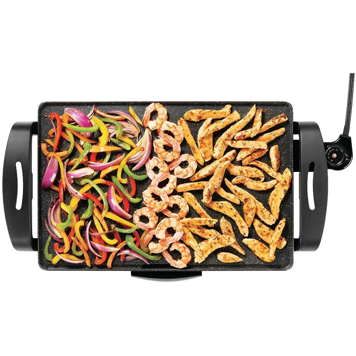 The Rock 19 in. x 13 in. Electric Griddle from Starfrit features patented Rock.Tec surface enhancement. This treatment is steel pellets that harden the surface of the grill making it tough as a rock. With unparalleled nonstick performance and ultimate scratch resistance, this griddle will stand the test of time. It is large enough to cook a full meal: meats on one side, eggs on the other or steak, fish or chicken on one side and vegetables on the other. There are so many combinations to choose from for many great meals. Model: SRFT024402.