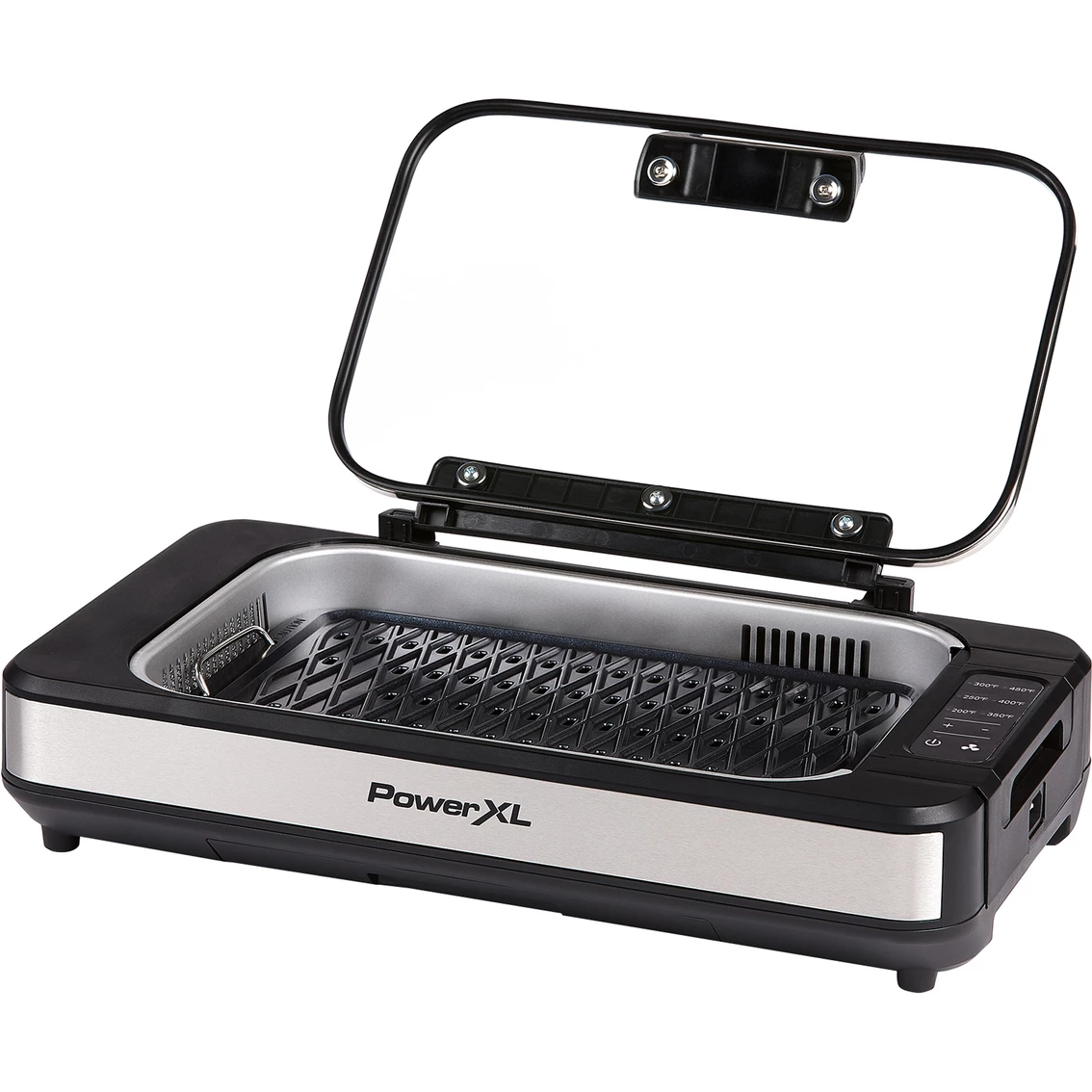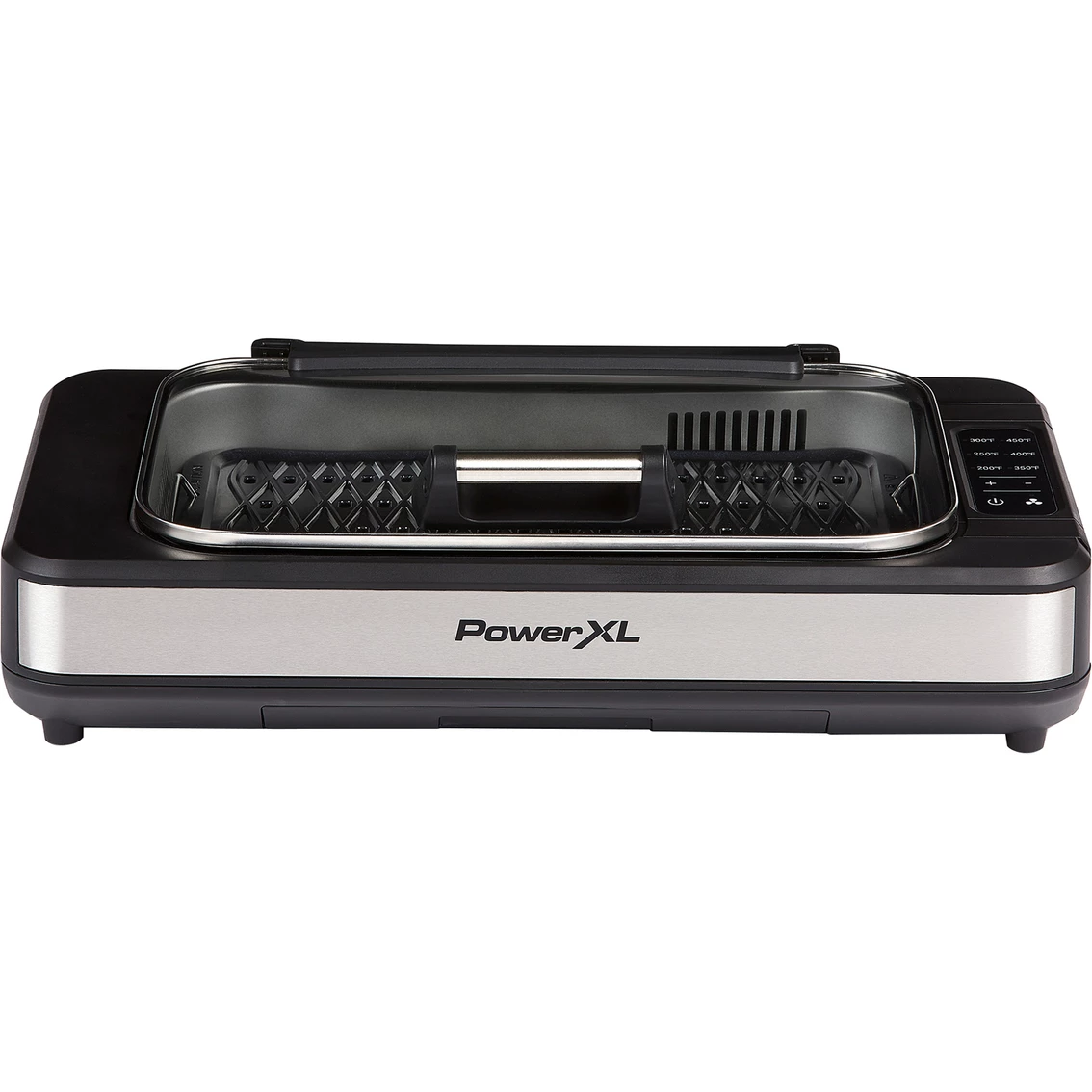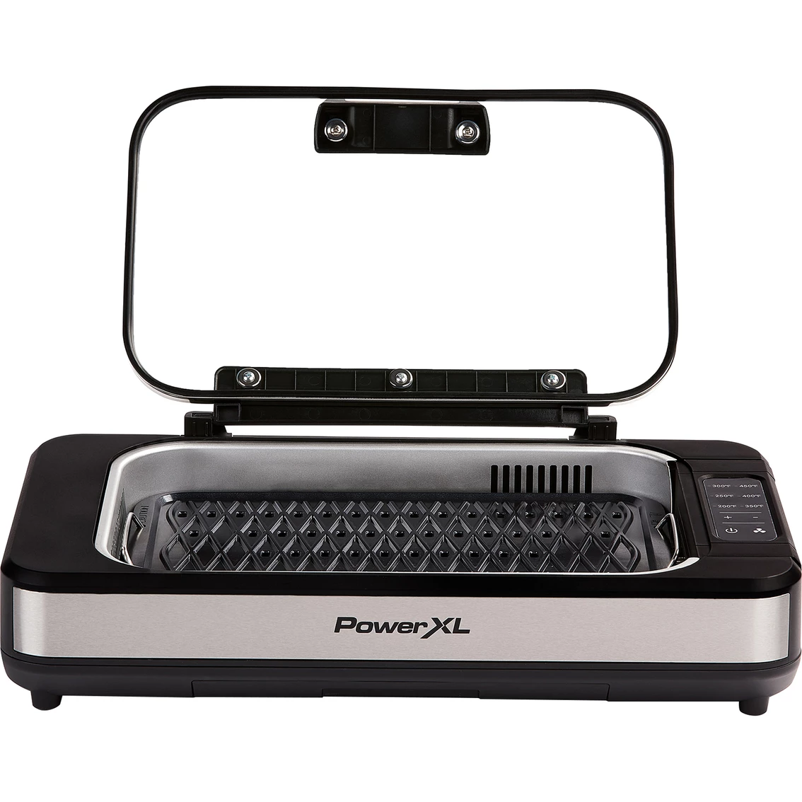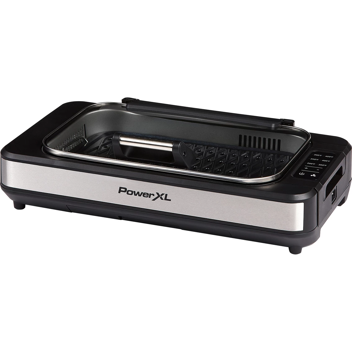 Enjoy grilling year-round. Airflow technology has built in suction fan that extracts smoke. Extra-large grilling surface. Ceramitech non-stick coating. Heavy duty die-cast aluminum grill plate. Removable dishwasher safe parts are ideal for easy cleaning. Cool touch handle. Adjustable temperature control. 1500 watts. Up to 450 degrees Fahrenheit cooking. Model: PXLSG-ELT.