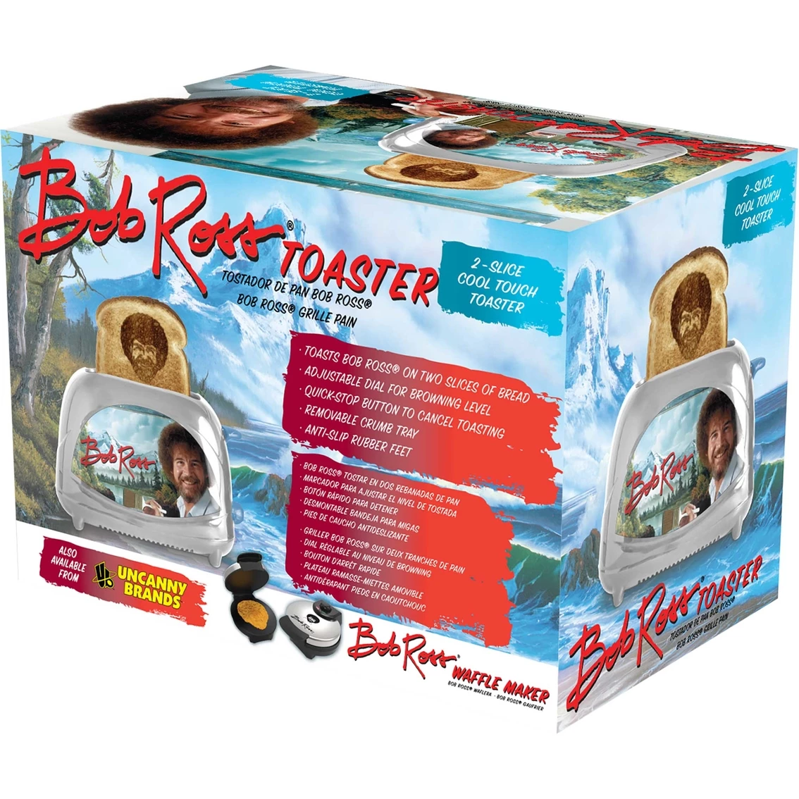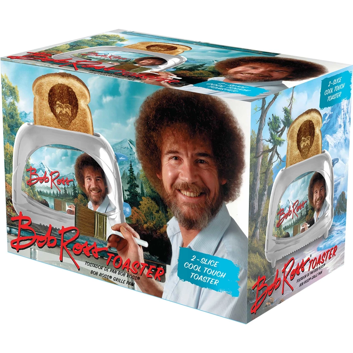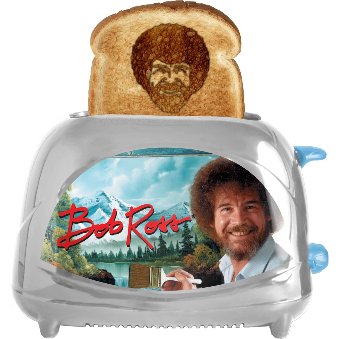 Make happy little toast at home with this Uncanny Brands Bob Ross Toaster. Two-slice toaster has reheat, defrost, and quick stop functions. Adjustable thermostat with an automatic manual switch-off. Drop bread into the slots, press the lever, and before you know it, up pops toast with Bob Ross’s smiling face and distinctive ‘do. Easy wipe clean. UL-listed. Model: TSTE-BOB-SLV.