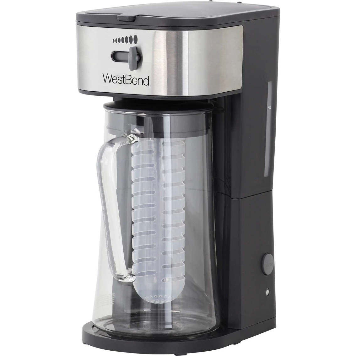 The West Bend Iced Tea Maker allows you to create cold, flavorful iced tea or iced coffee at the touch of a button. Adjustable brew-strength selector makes it easy to brew loose and bagged tea or coffee! Machine includes infusion tube to create a variety of flavored drinks. The large 2.75-qt. glass pitcher is dishwasher safe for easy clean up.